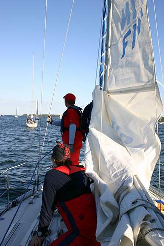 Meidänkin veneessämme läheni hetki jolloin purjeet nostettaisiin ensimmäistä kertaa tällä miehistöllä ylös - harjoitteluahan ei aiemmin oltu tehty.