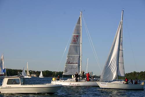 Tuomarivene vasemmalla, keskellä Tarantella II ja tuntematon kisakumppani oikealla.