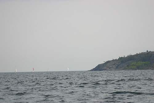 Suursaaren eteläkärki lähestyy, etäisyydessä näkyy, miten veneet nostavat spinnut ylös heti eteläkärjessä.