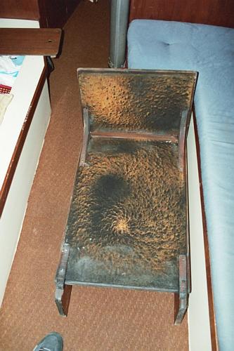 Kaikki muu paitsi purjeveneen kunnostus on turhaa... Moottoritilan luukkuna ovat portaat joiden sisäpinnassa on eristematto. Mukava näky. Pakoputki on kuulemma pamahtanut edellisellä käyttäjällä ja noennut koko moottoritilan sisältä.