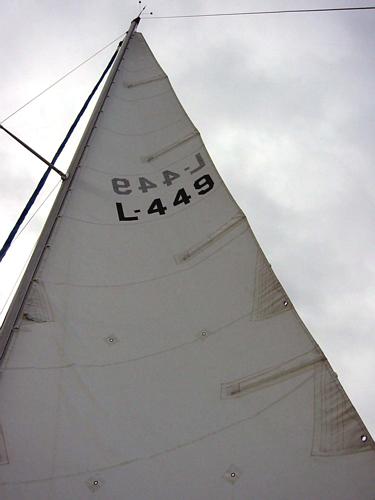 | Kaikki muu paitsi purjeveneen kunnostus on turhaa... Taitaa olla niitä "pakollisia" kuvia kaikista purjeveneistä - isopurje ja rekisterinumero... Isopurje oli suhteellisen hyvässä kunnossa - homepisteitä jonkin verran, mutta muuten aika timmissä kunnossa. Virtauslangat puuttuvat, mutta ne on helppo laittaa itsekin.