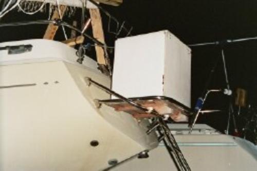 Veneessä olevan Eno-uunilieden kaasusäiliö on uimatasolle tehdyssä lastulevyisessä laatikossa. Pari vuotta vanha laatikko on jo reunoista pehmennyt ja on sekin uudistuskohteena ennen seuraavaa veneilykautta.