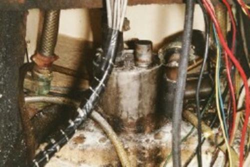 Vanha vedenerotin hieman lähempää. Kun pääsin tarkastelemaan miten se oli kiinnitetty, alkoi urakka hieman pohdituttaa. Käytössäni ei ollut mitään järeämpiä työkaluja joilla homma olisi saatu toki nopeasti vaikkakin aika raakaan malliin irti. Tovin pohdittuani keksin alkaa nakuttaa lasikuidun sisään lamintoituja kulmapaloja pultteineen näkyville taltalla ja lopulta Dremelin jyrsin-työkalulla. Aikaa irrottamiseen meni päivän verran. Savotta oli aika hankala sillä ulottuakseni pönttöön, piti asettua makuulleen konetilaan ja työskentelyasento ei ollut mikään kovin helppo.