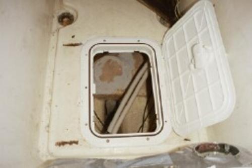 Sitlooran lattiaan tehtiin moottorinvaihdon yhteydessä aukko. Tarkoitus oli asentaa huoltoluukku moottorin päälle myöhemmin, mutta koneen irroitus oli Tekno Marinen mukaan helpompi näin. Aukosta tuli vain hieman liian suuri jotta toimitettu luukku olisi voitu asentaa poikittain. Asennusta varten jo tehtyä reikää suurennettiin hieman ja aukon reunoja siistittiin. Kiitos Sakelle sahauksesta.