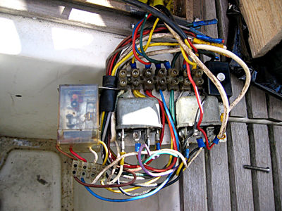 Osa poistetuista johdoista kulki veneen perässä olleeseen vanhan lämmittimen kytkintuluun, metallinen rotjake oli kiinni sitlooran seinämässä ja siinä oli mm. releitä ja sulakkeita. Pohdin tuotakin irroitellessani, mitä on mahtanut vanhan lämmittimen irroittanut kaveri miettiä jättäessään poistamansa vempaimen osia niin paljon vielä irrottamatta. Kenties miettinyt uudelleenasennusta? Tuskin - sen verran huonossa kunnossa nuo osat ja kaapeleiden liitokset olivat.