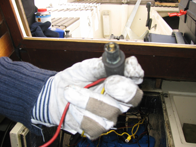 Vanhan sähkötaulun jäämistöä - merkkivalo. Nuo hanskat olivat vielä melkein neitseellisen puhtaat ennen varsinaisen puuhastelun alkamista - muuttuivat maalauksen, vahaamisen, sähkötöiden, gelgoatin kanssa leikkimisen myötä aika käyttökelvottomiksi. Erinomainen ostos silti, nahkaiset työsormikkaat kiristettävällä kädensuulla Starkista.