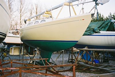 Vesillelaskua kohti Kun kyljet oli maalattu ja suuremmat sisätyöt tehty, oli aika maalata pohja. Vanhan mustan sijaan ostin edellisenä syksynä jo varastoon Bilteman sinistä myrkkymaalia. Päädyin kuitenkin Hempelin Mille Solo -vihreään. Ratkaisu taisi olla oikea, ainakin jos kuultuja kommentteja rannalla miettii. Vihreänvärisiä pohjamaaleja en muissa purjeveneissä nähnyt Sarvaston telakka-alueella (ainakaan omassa sektorissa).
