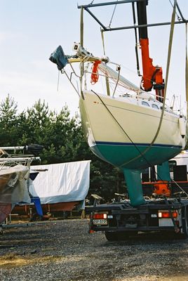Vesillelaskua kohti Kylki kiiltää aika kivasti - ainakin vielä tässä vaiheessa. Lavetilla tukevasti ja hissukseen peruuttaen pois venesolasta. Nostossa hyvänä apuna olivat Sakke, Jakke ja Chrisse. Kiitos :)