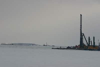 Vuosaaren tuleva satama-allas ja sen ruoppauskalustoa laiturissa.