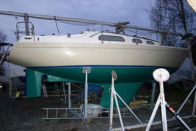 Kunnostuskohteita, osa 3 Kyljet kiillotettuna Starbriten teflon-pohjaisella vahalla. Ensin hiontapastalla käsin kyljet kauttaaltaan ja sitten kahteen kertaan vahaus. Vaha oli pastamaista jonka levitys omalla kiillotuskoneella ei onnistunut, eli käsipelillä piti sekin tehdä - wax in, wax out.. tuli mieleen Karate Kid. Pohja on myös saanut uuden Hempelin antifoulingmaalikerroksen.