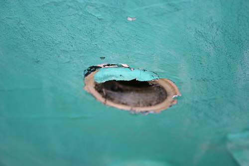 Läpivienti poistettuna.. melko paksu on Ohlsonin runko. Läpivienti oli tiivistetty silikonilla, eikä runkoa oltu suojattu primerilla, läpiviennin reunoista puhumattakaan.