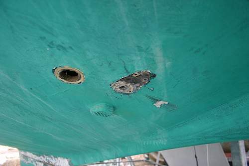 Tässä läpivienti ja vanha potkuriloki irrotettuna.. moottorin vedenoton läpivienti toistaiseksi paikoillaan..