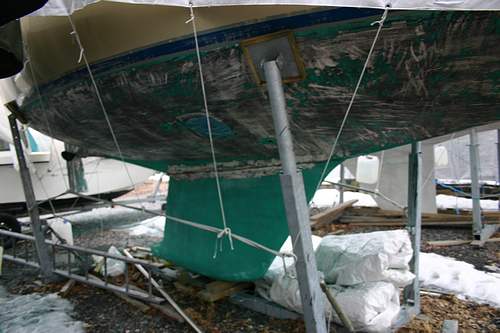 Kunnostuskohteita, osa 4 Käsin skrabaamalla myrkkymaali poistu rapisten alle levittämilleni vanhan pressun kappaleille. Joissakin kohdin myrkkymaali oli niin kovaa, etten saanut päällimmäistäkään maalikerrosta irtoamaan. Aikaa skrabaamiseen meni n. viisi tuntia.