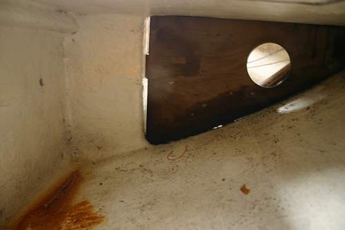 Kunnostuskohteita, osa 4 Kun hionta oli tehty, oli aika keskittyä toviksi sisähommiin. Päästyäni laminoinnin makuun etsin uusia kohteita eri puolilta venettä. Olin harmitellut veden kulkeutumista paapuurin puoleisen kapyysin bunkan alla olevaan säilytystilaan. Syy näkyy tässä. Laipio on hyvin "hengittävä" reunoistaan. Reikä on vanhaa lämmittimen putkea varten. Kun pilssiin tuli (sade)vettä, kulkeutui se veneen kallistellessa ensin pentterin alle ja sieltä laipion raoista bunkan alle hyvin sujuvasti. Vaan ei enää tulevana suvena. Laminoin molemmilta puolelta laipion alareunan ja tuossa näkyvän vasemman reunan umpeen - vesi saa nousta aika paljon valuakseen vanhan lämmittimen läpiviennistä tälle puolen. Yksi kuiva säilytystila lisää miehistölle ;)