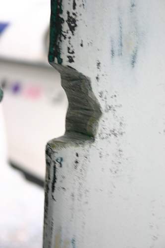 Kunnostuskohteita, osa 4 Peräsimessä oli potkurin kohdalle rouhittu melkoinen kolo. Laminoinnin seuraava kohde. Täytin kolon sen ensin karkeaksi raspilla rouhittuani lasikuitufillerillä ja pakkeloin tasaiseksi ennen maalaamista. Ja kun kiinnitin potkuriakselin päähän sinkkianodia, tajusin, miksi kolo oli siinä.. eipä mahtunut väliin enää kuusioavain vääntämään kiinnitysmutteria. No lopulta eri ruuvinvääntimien kuusiopäillä ja jakoavaimella sain mutterin kiinni vaivatta.