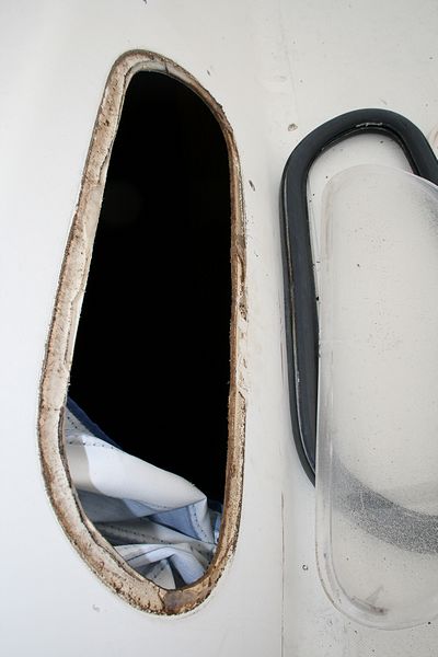 Ensimmäinen ikkuna irti. Aika mielenkiintoisen näköinen tuo ikkuna-aukon reuna... Silikonia ei tiivistyksessä oltu aikanaan säästelty.