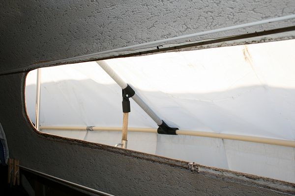 Näkymä sisältä ilman ikkunaa. Samalla näyte pressutelineen rakenteesta: harjanvarren pätkä kaidetolpan jalkaan, exel- ja sähköjohtoputkea varsinaisena kannattimena.