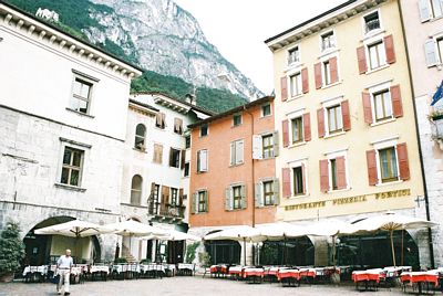 Lago di Garda Rivan keskustoria edelleen.. Tässä näkyy myös pari ravintolaa, tuossa jossa on punaiset aluspöytäliinat, on hyvä salaattibuffet alkupalaksi tai ihan pääruoaksikin. Vasemmanpuoleisessa on hyvät kala-annokset, mutta kokemukseni mukaanmelko kehno tarjoilu varsinkin yksin matkaavalle.