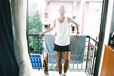 Elokuussa 2002 kävin myös juosten Arcossa (tunnin lenkki), tässä paluun jälkeistä ja reissun viimeisen illan tunnelmaa itselaukaisimella kuvattuna. Ennen suihkua :)