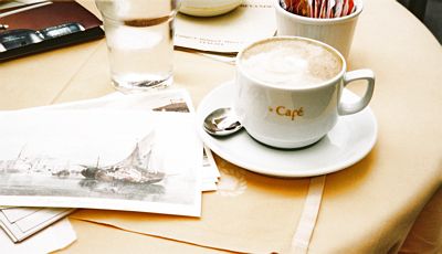Lago di Garda Matkalla pitää muistaa kotona olevia ystäviä teemalla "olisitpa sinäkin täällä ähäkutti kun on lämmintä ja kivaa kun siellä sataa vettä". Tässä cappuccinoa Rivan satamakahvilassa korttien kirjoittamisen lomassa.