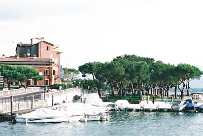 Lago di Garda Desenzanon rantaa ja satamansuuta. Puiden siimeksessä on mukava lueskella kirjaa päivän kuumina hetkinä penkeillä istuskellen tai nurmikolla loikoillen. Haasteena tuota rantakatua pitkin kulkeva aika vilkas liikenne.