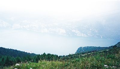 Lago di Garda Maisemia ylhäältä vuoriniityiltä alas Malcesinen kohdalta. Alhaalla näkyvän metsäisen "niemen" kärjessä näkyy tie jota pitkin ylös pääsee kävellen. Itse tulen tässä toista reittiä, joka kulkee metsäisen luonnonsuojelualueen kautta. Ylös pääsee myös gondolihissillä joka on uusittu vuonna 2002.