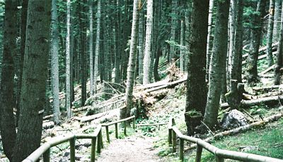 Malcesinen yläpuolisen luonnonsuojelualueen myrskyntuhoja 2001. Vain polut ja tiet oli raivattu auki.