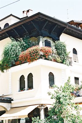Sirmionen kaupungista löytyi ranskalaisten parvekkeiden kukkaloiston lisäksi myös katonharjassa olevia patioita ja isompia parvekkeita. Kukkaloistoa loputtomiin.