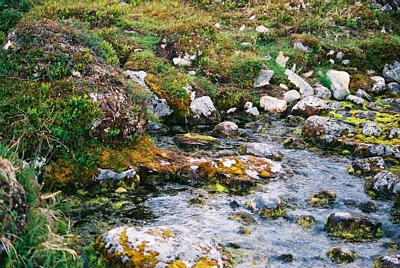 Vuonna 2002 tuli lomailtua ja matkailtua kohtuullisen paljon - ennenkaikkea luonnossa. Kohti Guivia edetessä kuljettiin aika pitkään myös soisessa ja kosteassa maassa. Onneksi kelit olivat olleet kuivia, pärjäsin mainiosti vaelluskengillä - drymax-pinta ja nahansuojasprayllä kengät pysyivät täysin kuivina koko reissun. Jossain välissä jouduin kävelemään muutaman sata metriä sivuun reitiltä aika vuolaan puron vartta ylityspaikkaa etsiessäni - ja törmäsin puron alkulähteseen (kuvassa siis). Maan sisästä pulppusi yllättävän voimallisesti kirkasta ja hyvänmakuista vettä joka muodosti yhden vuolaimmista puroista reissun aikana.. Kaikkea ihmeellistä sitä näkee kun vain viitsii lähteä ruuhkasuomesta luontoon.. suosittelen.