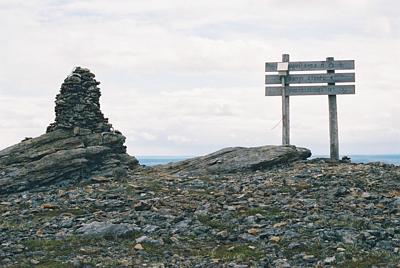 Guivin huippu. kivipatsas ja suuntaviitat.. Huipulla tuuli.