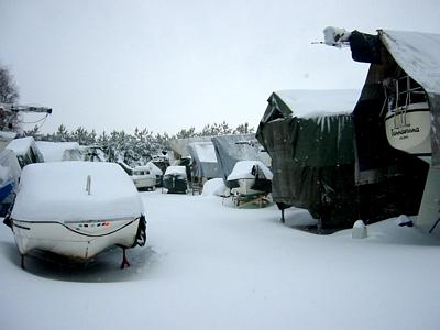 | Kaikki muu paitsi lumisen purjeveneen kunnostus on turhaa... Ohlson 29 makoilee tuolla oikeanpuoleisessa rivissä viimeisten veneiden joukossa. Lumipeite satamassa oli koskematon 1.2.2004 sinne Saken kanssa saavuttuamme.. Lunta oli paikoin yli puolen säären.