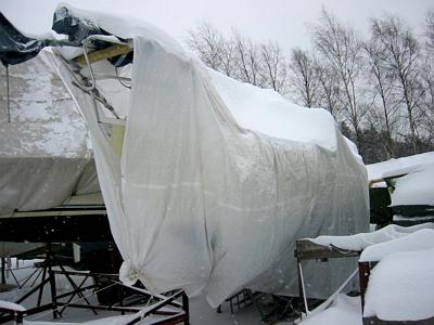 Kaikki muu paitsi lumisen purjeveneen kunnostus on turhaa... Hyvin on pysynyt pressu paikoillaan. Konttailin kannella ja tönin lunta alas. Nyt ilma pääsee kiertämään hieman paremmin pressun alla. Mittasin kajuutan luukun uuden tekemistä varten - vanha alkaa murentua reunoistaan sormiin. Lähtiessäni veneeltä kiinnittelin mukana olleella narulla viereisen veneen pressua hieman paremmin, se oli siirtynyt myrskyn aikana melko taakse. Lisäksi pressun reunoissa roikkuvat laudat paukuttivat tuulessa veneen kylkiin ikävästi, toivotaan, ettei liike ole aiheuttanut pahempia vaurioita.