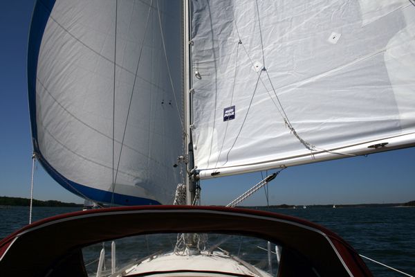 Uusi isopurje virsikirjassa. Purjeen etuliikin halssikulma oli leikattu Meripurjeessa liian eteen ja jouduin virittelemään sitä aika paljon, että sain purjeen istumaan.