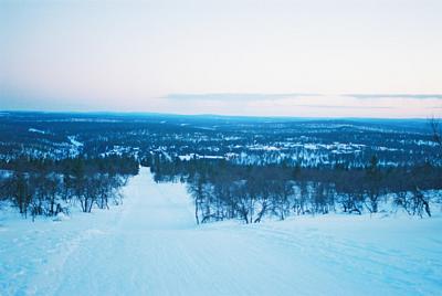 Pulkkamäki Kaunispään huipulta. Alhaalla häämöttävät Saariselän keskuksen talot illan sinessä.