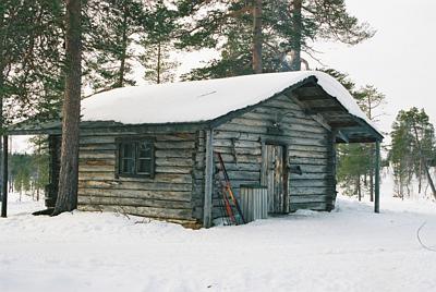 Kuukkelilampea ennen oleva taukopaikka - tänne pitää poiketa hieman varsinaiselta reitiltä. Mukava maja, mutta tulipesä on huonosti suunniteltu. Puut pitää kasata pystyyn nurkkaan ja saada vetämään hyvin avonaisen takan liian pienestä hormista. Savu puskee suurella varmuudella pitkin tupaa ennenkuin hormi lämpenee ja alkaa vetää.