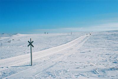 Kiilopään kupeesta latu-ura kohti Laanilaa kiilopään harjan yli. Kiilopään huippu on tästä kuvasta oikealle. Latu ei kierrä huipun kautta.