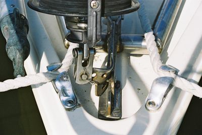 Kesän 2004 purjehduskuvia Keulastaagin kiinnityslevy vääntyneenä. Onneksi tuo vääntynyt levy on kiinni mastonkaatojärjestelmässä jonka alla on varsinainen kiinnityslevy kannessa. Sain keulastaagin kiinni alempaan levyyn löysäämällä takastaagia ja vantteja jonkin verran.. eikä ole haitannut toistaiseksi kulkua..