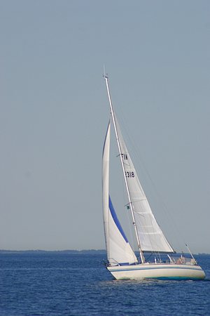 Kesän 2005 purjehduskuvia Lähempänä saaria Porkkalan selän länsilaidalla tuulikin alkoi jo hieman kuljettaa veneitä paremmin.. me olimme laittaneet peltifokan vetämään jo tovia aiemmin - tämä vene ajoi kuutta solmua kevyesti rinnallamme purjein.