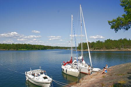 Kesän 2005 purjehduskuvia Ja perillä Byxholmenin rannassa. Keksin saaren tavallaan vahingossa kun olimme matkalla Modermaganiin ja selasin Partiolaisten Saaristokirjaa eteenpäin. Uudenmaan virkistysalueyhdistyksen saari, jossa on itselämmitettävä sauna. Tässä saaren pohjoiskulmassa on pari poijua joista toiseen pääsimme toisen purjeveneen kanssa vierekkäin. Naapuriveneen kuski kertoi, että hän oli tullessaan löytänyt tuosta veneiden oikealta puolelta kiven melko pinnasta - joutui vähän sovittelemaan päästäkseen rantautumaan kunnolla.