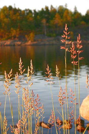 Ilta-aurinko värjää rannan kasveja entistä punaisemmiksi Byxholmenissa.