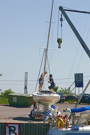 Kesän 2005 purjehduskuvia Tulin Hankoon tiistaina ennen torstaina alkavaa regattaa. Veneestä oli hauska seurata kisoihin valmistautuvia veneitä, kuten tässä vastapäisellä laiturilla Louhien mastojen pystytystä ja vesillelaskua.