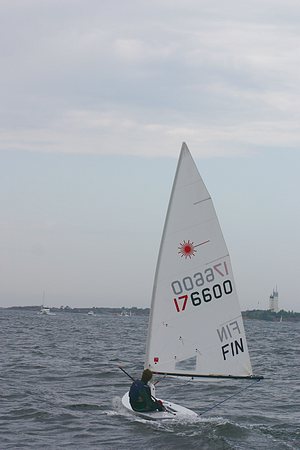 Kesän 2005 purjehduskuvia Kuljimme koneella kohti Tulliniemen salmea ja samaan aikaan Hankoniemen edessä valmistautuivat Laserit omaan regattaansa. Tämä kaveri ajoi perästämme rinnalle ja huikkasi, mikseivät purjeet ole ylhäällä ja painoi taas menemään kohti starttialuetta. Aika haipakkaa.