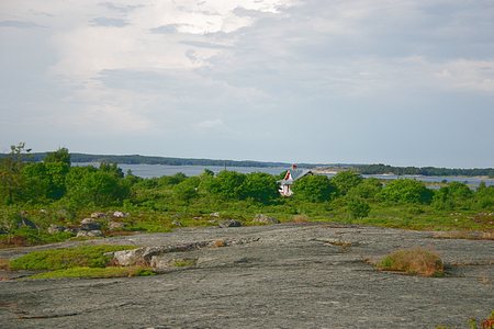 Matalan metsikön ja pensaiden välistä näkyy siellä täällä taloja ja mökkejä - vakituisia asukkaita saarella on joidenkin tietolähteiden mukaan yksi.