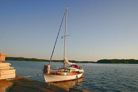Perillä Maskinammossa. Tulimme tuon takana näkyvän selän yli, sieltä vasemmalle ja suoraan kohti etelää ja ollaan Verkanin satamassa. Mikan tontin tunnisti jo etäältä rannalla olevasta lautapinosta ja veneestä jonka keulalla könötti kiuas rakenteilla olevaan saunaan..