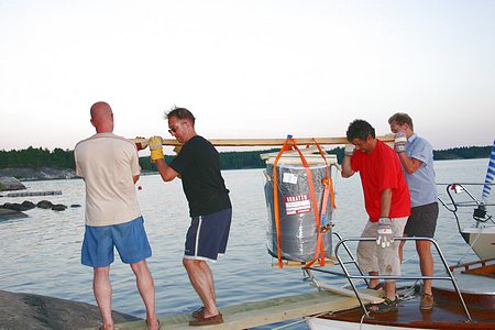 Nouseehan tuo 70 kg painava kiuas kun on neljä kaveria nostamassa.. tilapäinen silta vain arvelutti viimeisenä kantaessa - jalkoihin ei pahemmin pystynyt katsomaan..