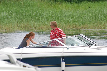 Kesän 2005 purjehduskuvia Vuoden 2005 venereissu osoitti, että tuttuja riittää saaristossa kesällä. Alangon Rami oli vaimonsa kanssa tullut piknikille uudella veneellään. He lähtivät syötyään vapauttamaan lastenhoitajaa - aika helppoa se on moottoriveneellä Turun saaristossa liikkuminen.