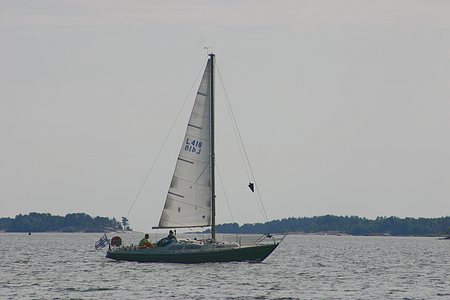 Erittäin harvinainen näky lyhyen purjehdusurani aikana. Purje ylhäällä, koneella ajettaessa musta varoituskolmio ylhäällä, niinkuin pitääkin.