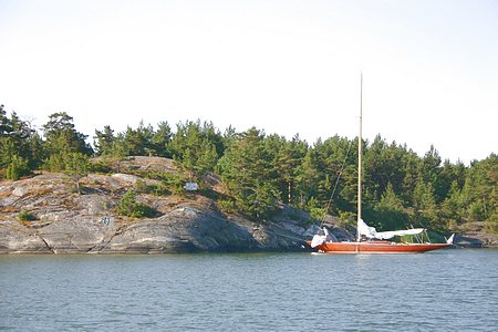 Kesän 2005 purjehduskuvia Aamulla matka jatkui Gullkrona lännen kautta kiertäen kohti Kasnäsiä. Tässä suurten purjeveneiden kiinnittymispaikka Gullkronassa. Tuossa kalliolla olevassa valkoisessa lätkässä lukee "big boats". Ja s/y Vågspel on hyvä esimerkki isosta veneestä.