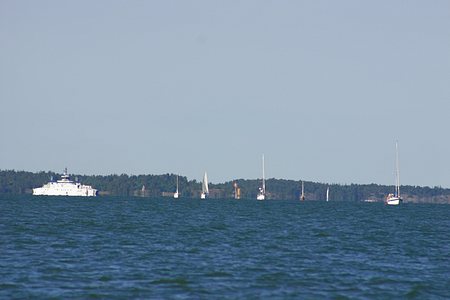Hiittisten lautta tulossa kohti Kasnäsiä - edessä väylä joka kulkee Hiittisten ohi kohti saaristomerta oikealle, ja vasemmalle kohti itää ja Hankoa.