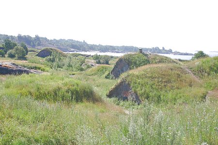 Vallien välissä ruohottuneita ammusvarastoja, ihan kuin hobittikylä.